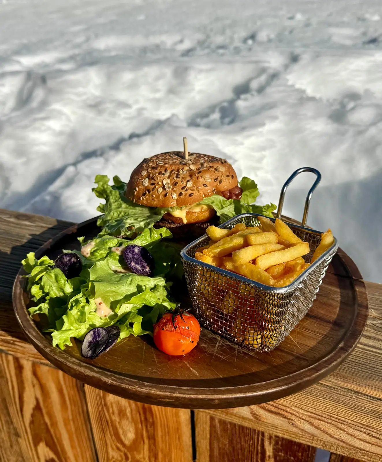 Une cuisine de brasserie montagnarde généreuse : Burger montagnard, tartiflette XXL, boite chaude, pizza amore, moelleux au chocolat Valrhona, baba au Génépi… La carte joue l’équilibre entre traditions alpines, inspirations du moment et classiques revisités.